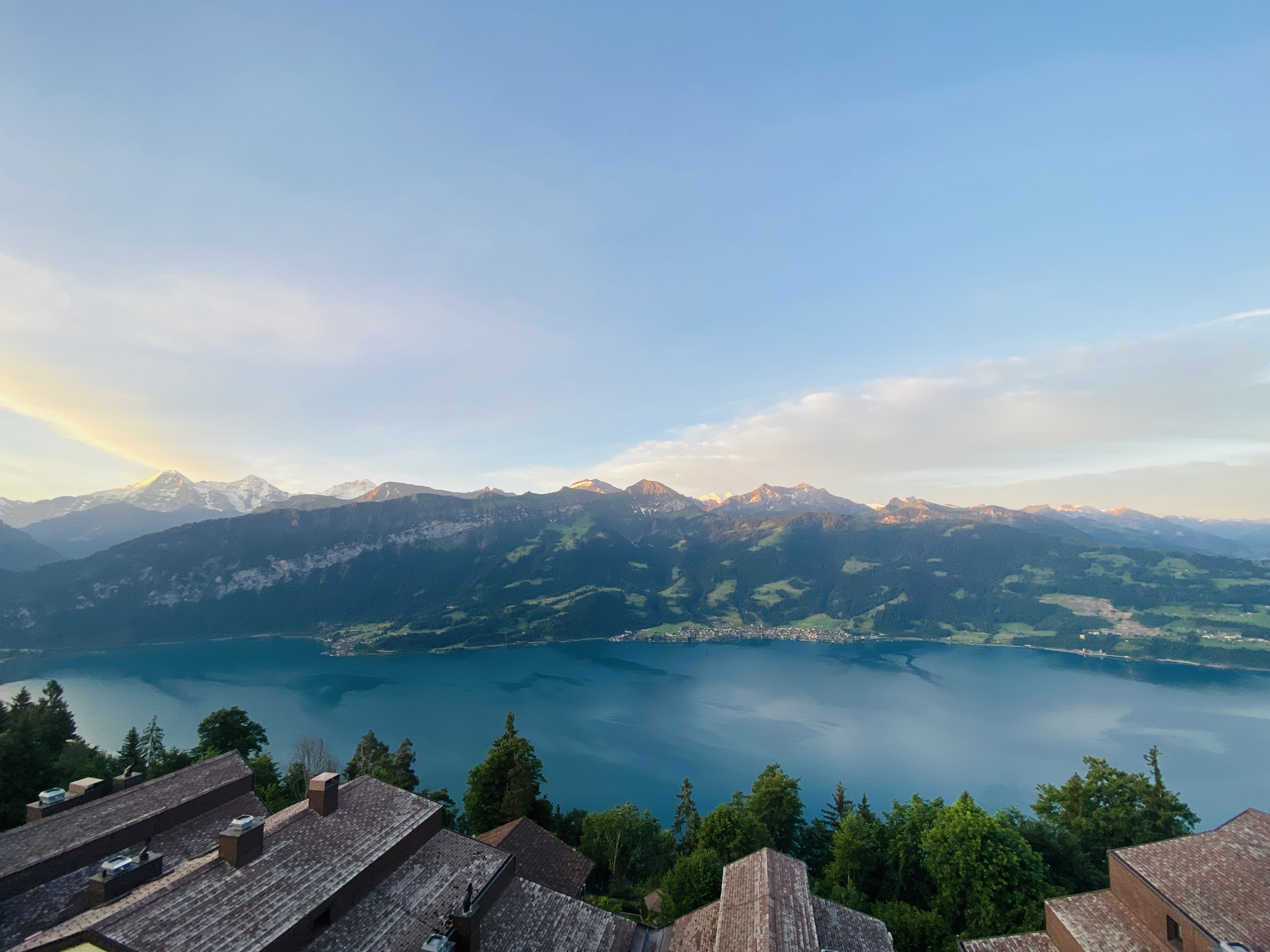 4h30 sáng, bầu trời đã lên 1 nửa, hắt ánh sáng bình minh lên đỉnh ngọn núi ánh lên một màu hồng đỏ giống như trong lò than, khung cảnh tuyệt đối yên tĩnh, mặt hồ như một tấm gương xanh thẳm hắt lên ánh sáng lúc bình minh này đầy ma mị, mình hít thở đầy lồng ngực cái không khí 6độc đấy và im lặng nghe một bản hoà ca líu lo của đám chim trú ở cánh rừng thông gần đây.