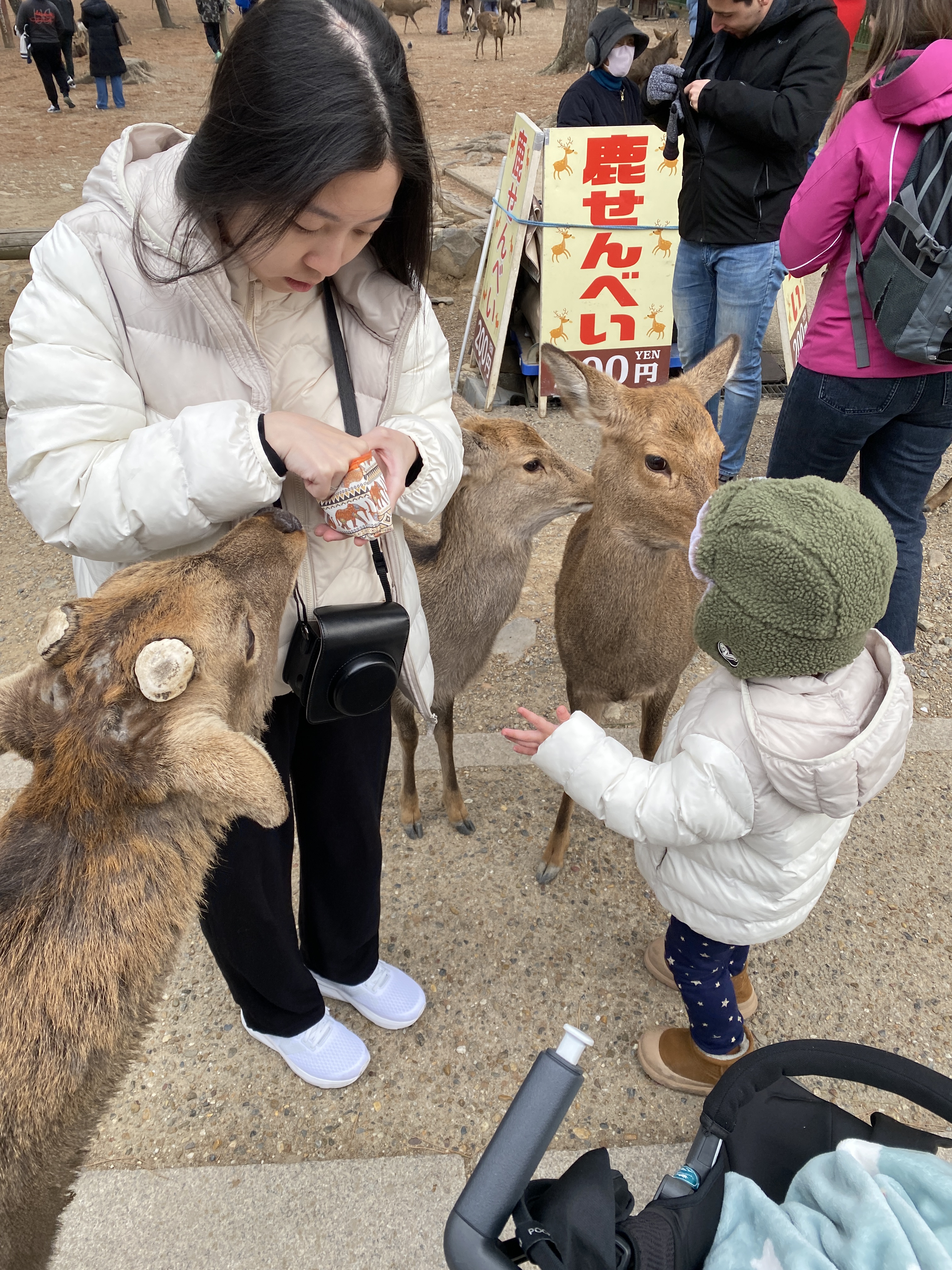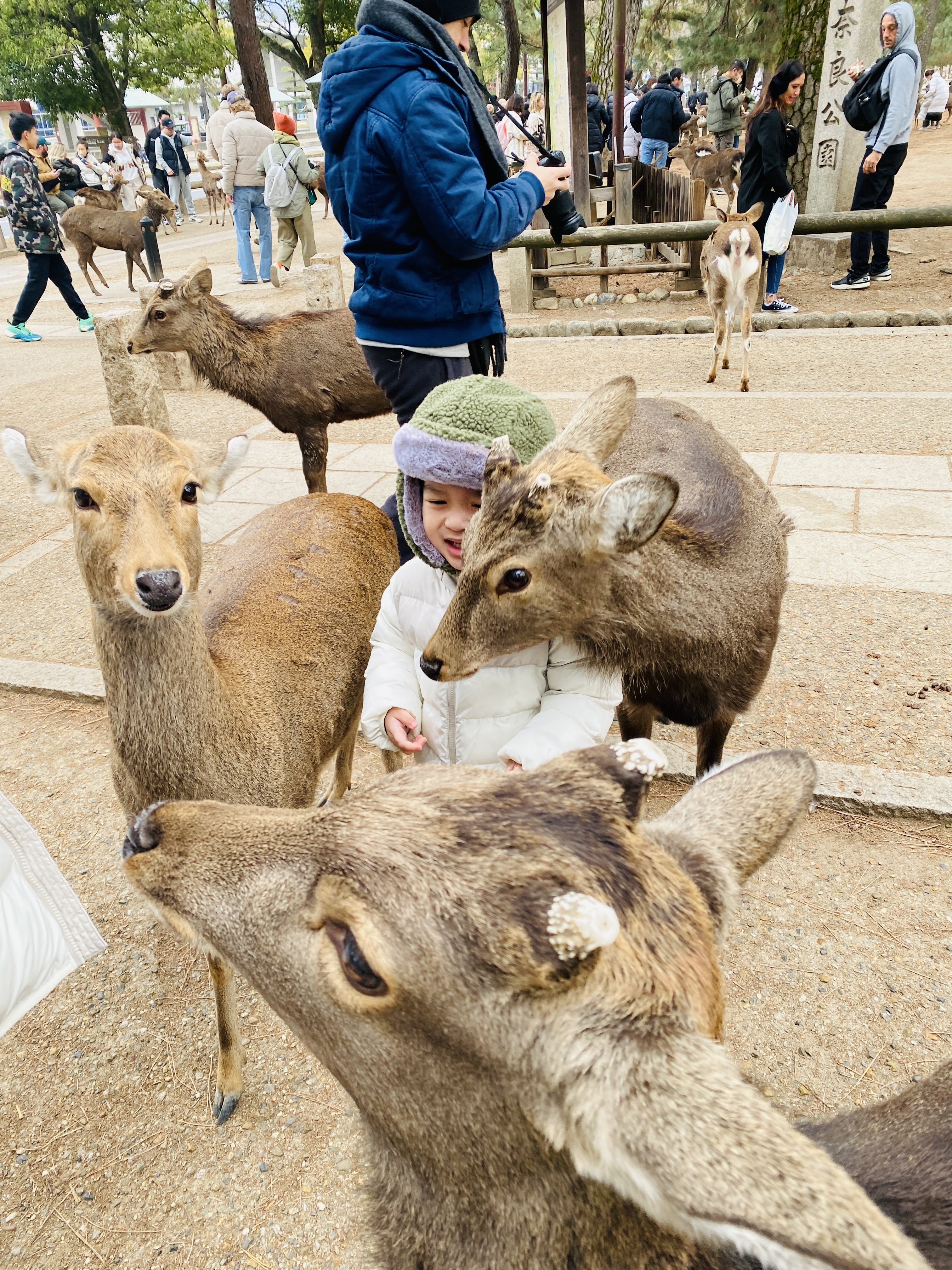Điểm nhấn của chuyến đi này là round đi Nara cho nai ăn, các bạn Nai được chăm sóc kĩ lưỡng, vui vẻ và dạn dĩ ngập tràn mọi lối đi ở Nara Park. Các bạn Nai ra cúi cúi đầu chào và xin ăn, :)) đồ ăn là loại cookie được bán với giá 200Y/pack và trong 30min các bạn Nai đã chén của e Bơ 10 pack :))