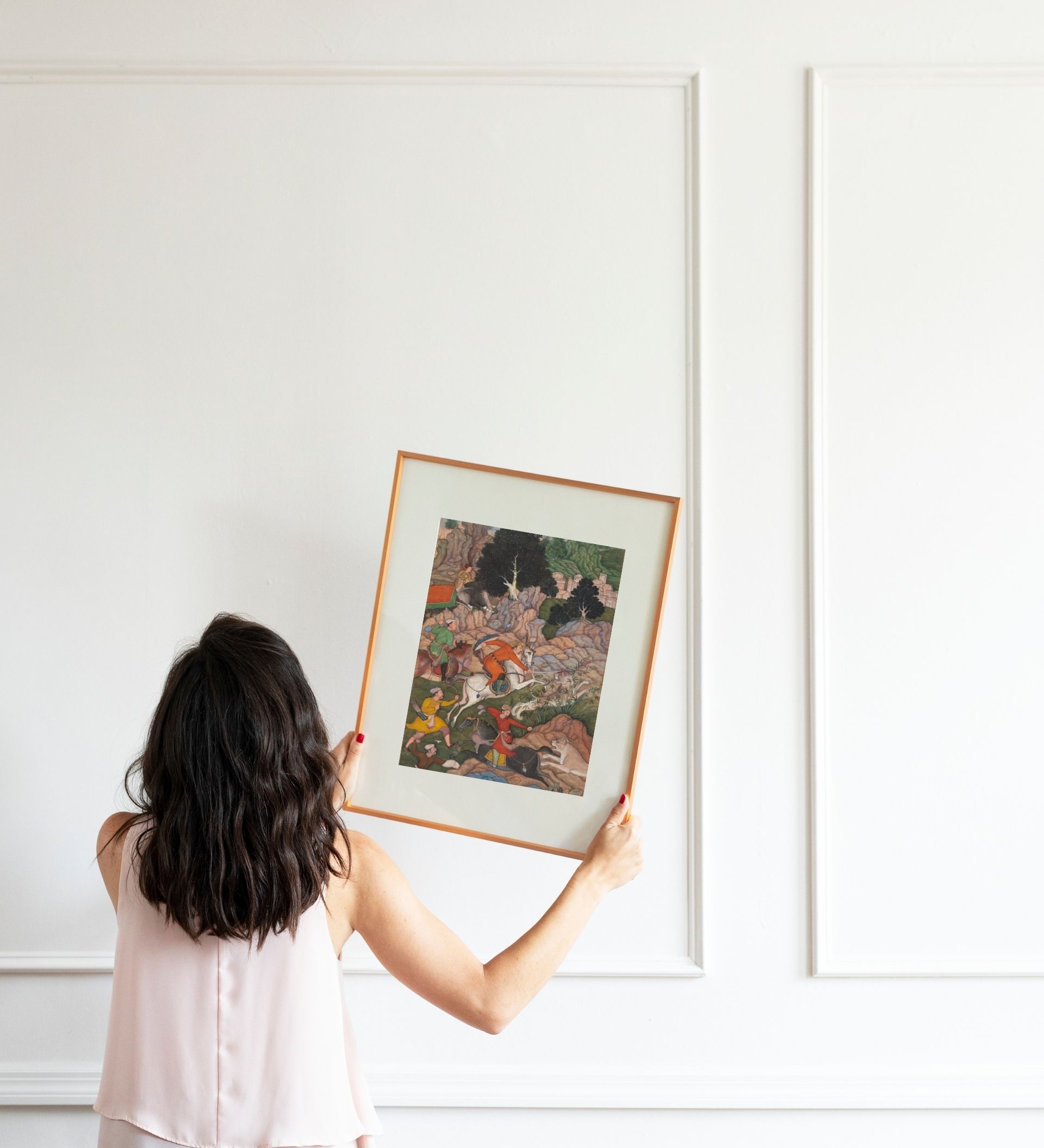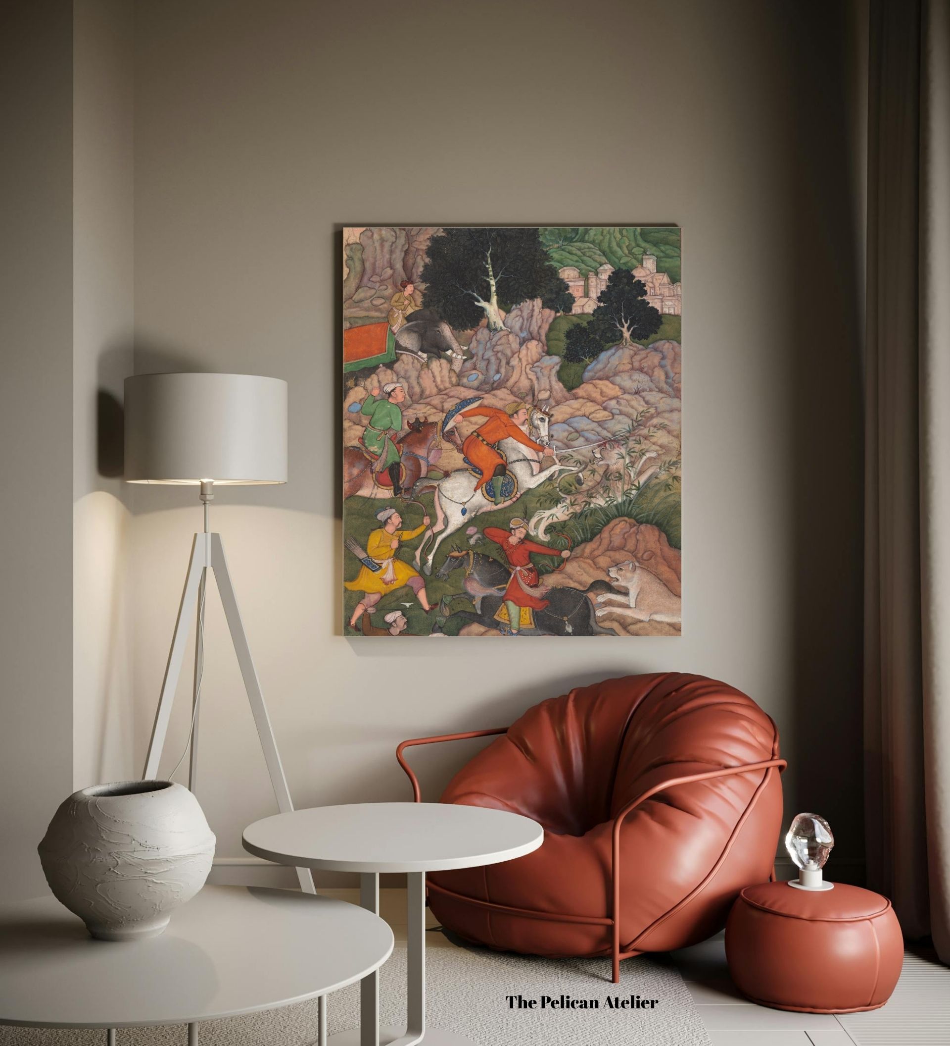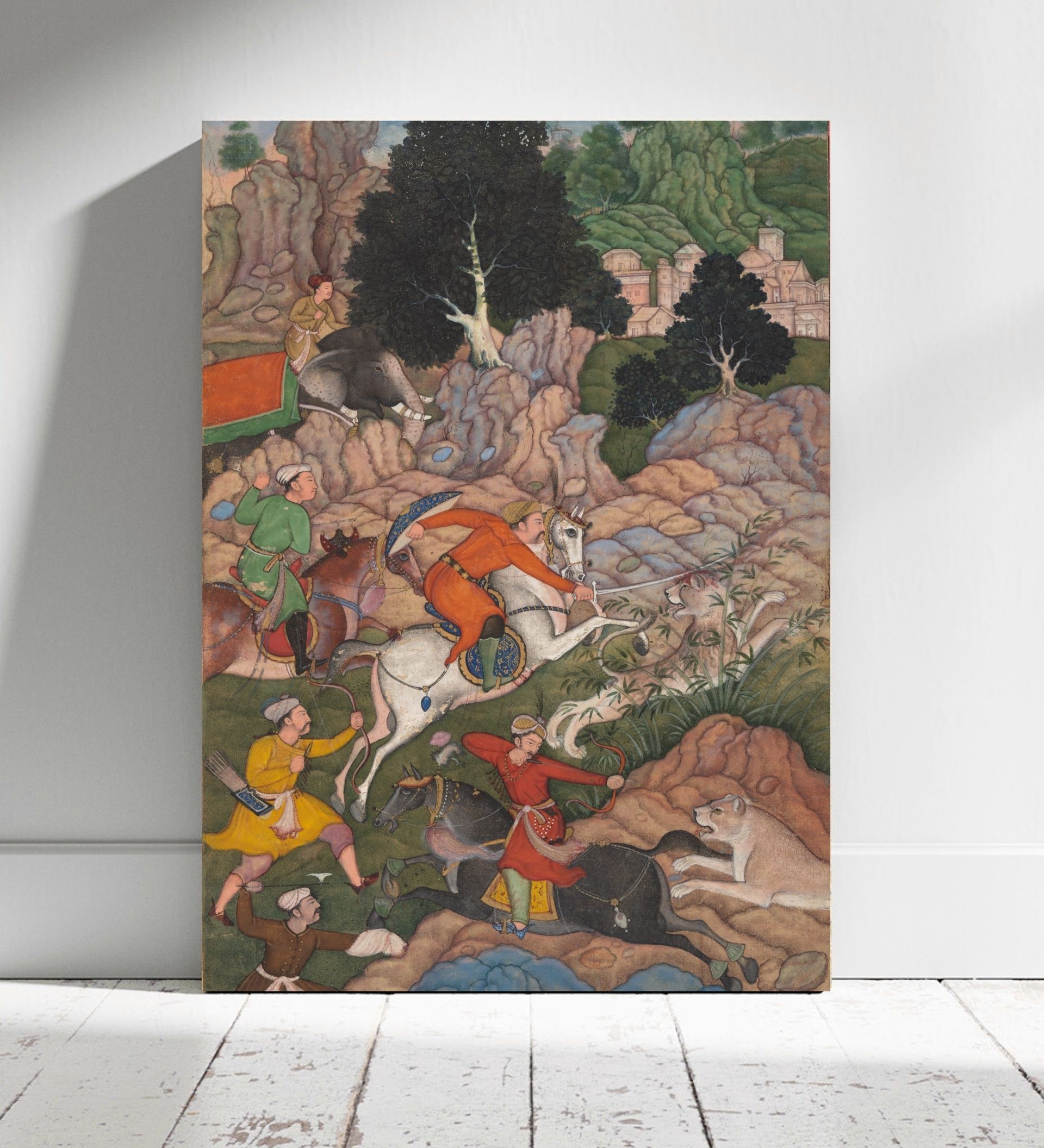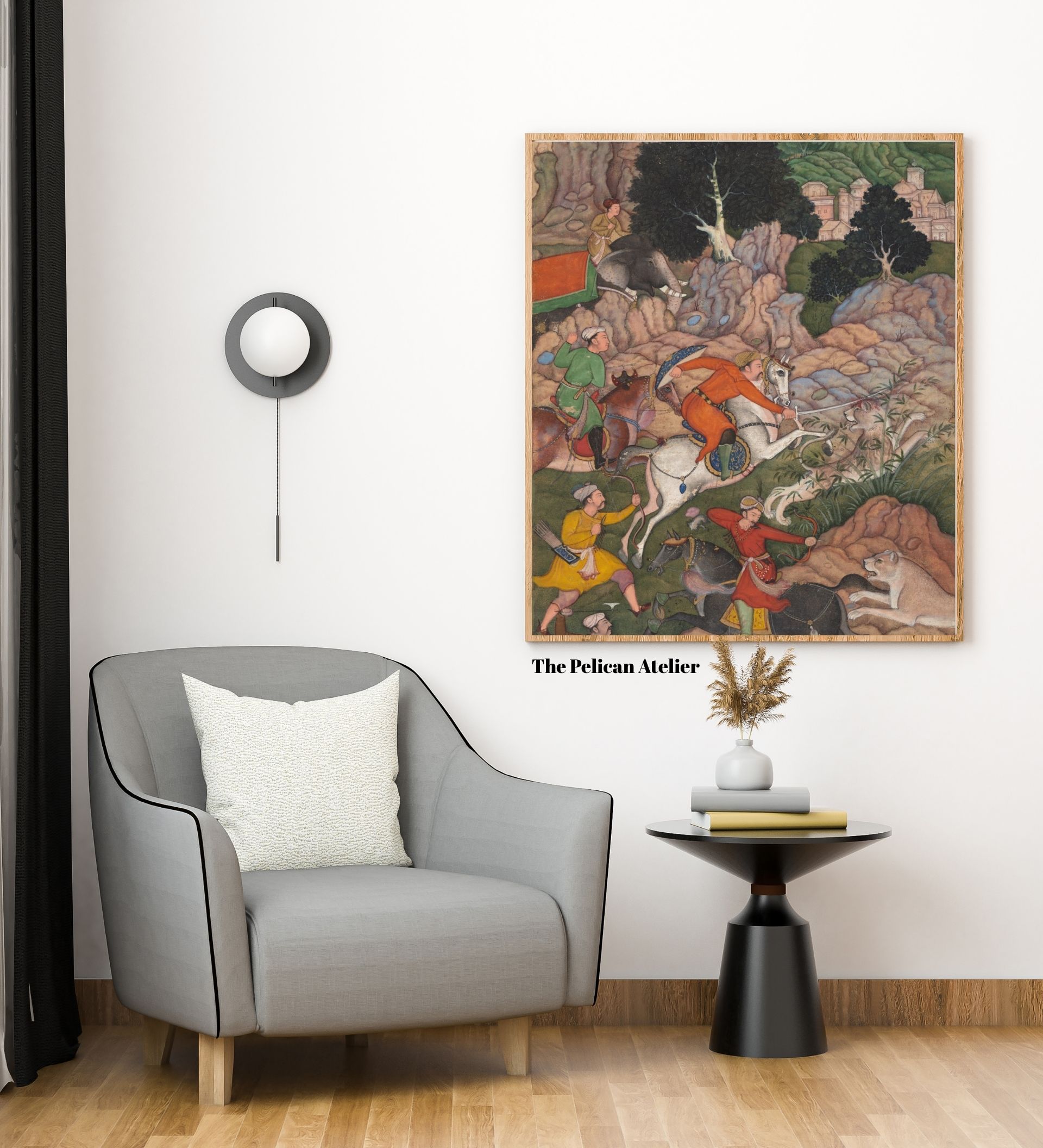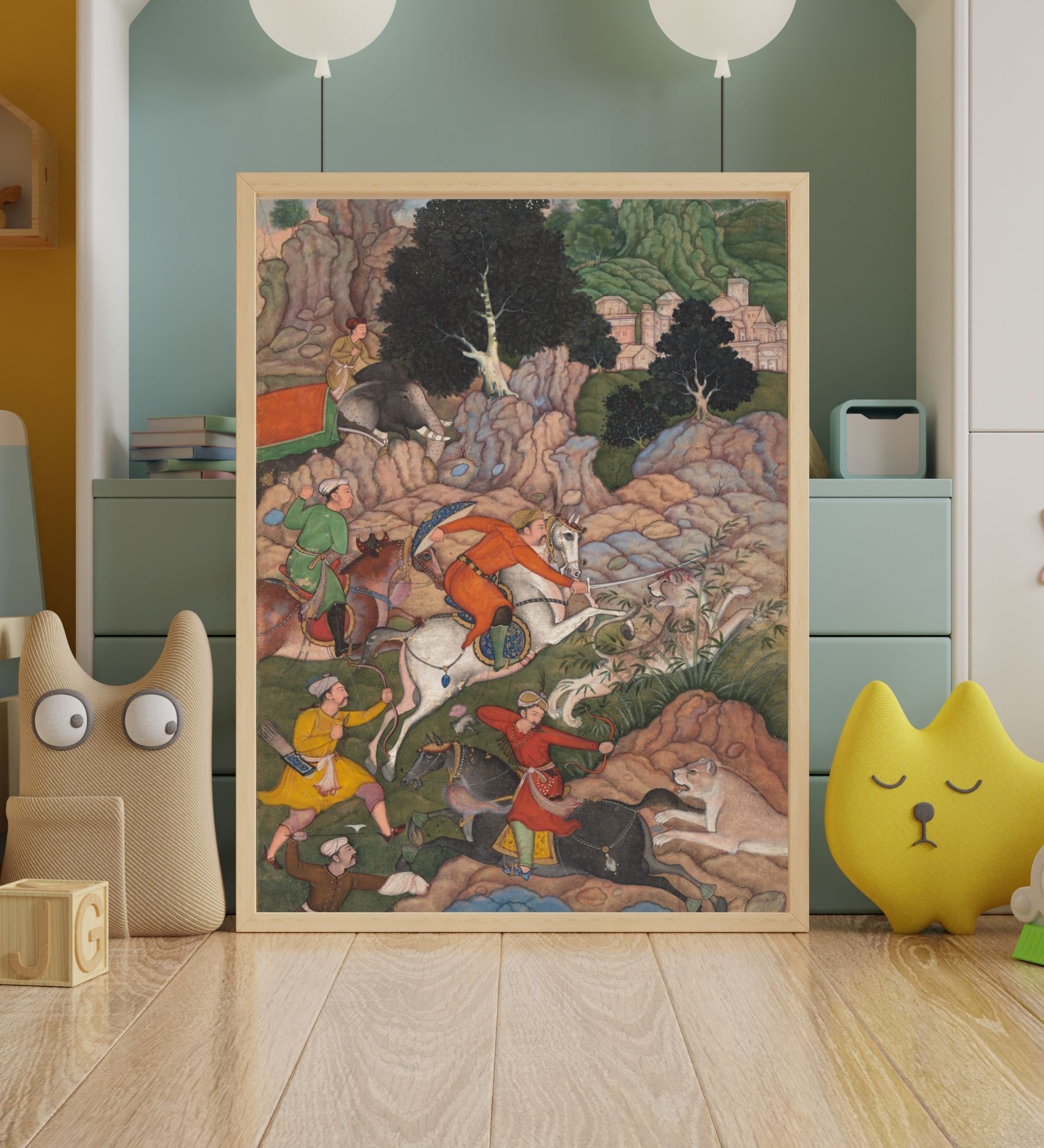One striking example is the late 16th-century folio Akbar Hunting. Emperor Akbar is shown lunging at a lioness, his sword gleaming, surrounded by noble companions. The formation resembles a battlefield, underscoring that a hunt was never just leisure, it was practice for war and a metaphor for kingship. To kill the lion, an animal reserved only for emperors, was to claim ultimate valor. You can even explore a beautiful reproduction of this work as wall art on Etsy here.