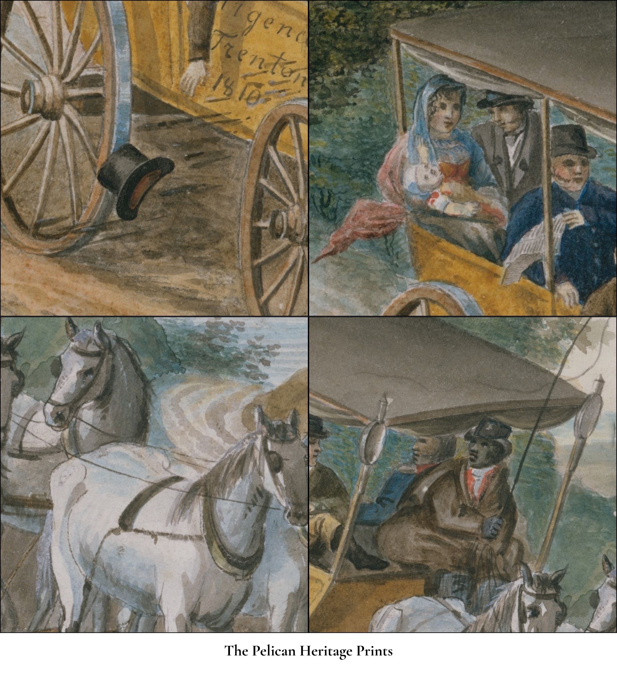 Svinin himself was a Russian diplomat, writer, and amateur artist who spent time in the United States during the early 1810s. He had an eye for the everyday ordinary people going about their business but he rendered them with a mix of documentary precision and playful charm. This particular watercolor, painted with gouache and pen on off-white paper, shows a bustling stagecoach journey near Trenton, New Jersey. The inscription “D[-]ligence / Trenton / 1810” on the coach door grounds it in time, almost like a travel diary entry.