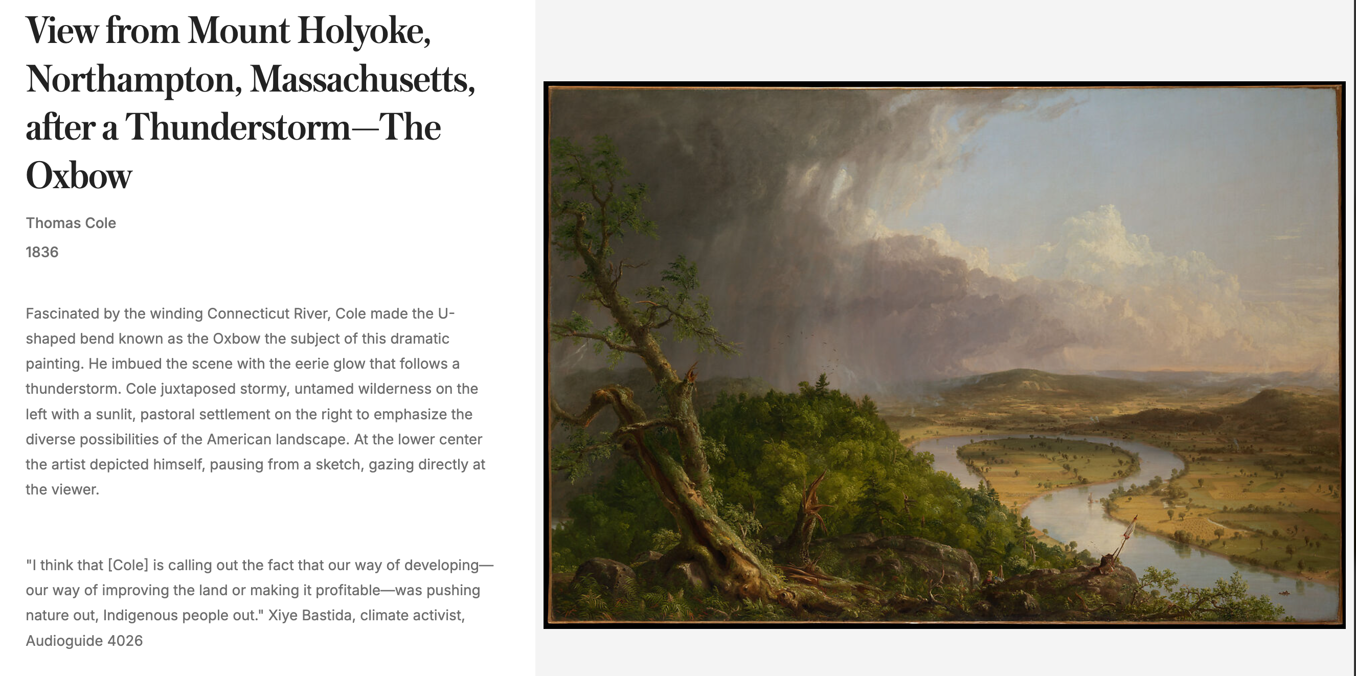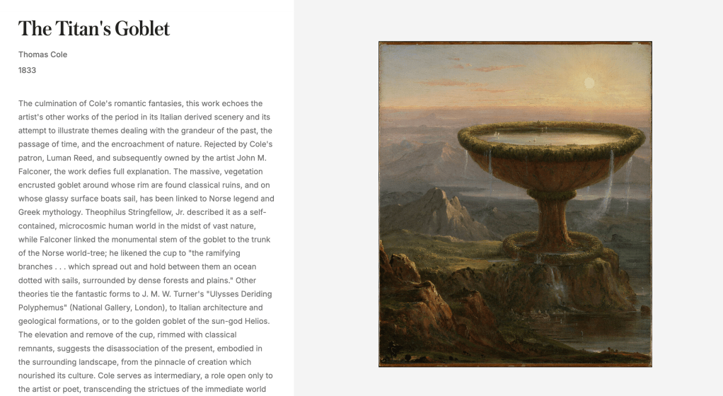 From the start, Cole’s style was marked by dramatic forms and vigorous technique, reflecting the British aesthetic theory of the Sublime, or fearsome, in nature. In the representation of American landscape, really in its infancy in the early nineteenth century, the application of the Sublime was virtually unprecedented, and moreover accorded with a growing appreciation of the wildness of native scenery that had not been seriously addressed by Cole’s predecessors. However, the wilderness theme had earlier gained currency in American literature, especially in the “Leatherstocking” novels of James Fenimore Cooper, which were set in the upstate New York locales that became Cole’s earliest subjects, including several pictures illustrating scenes from the novels. Fired by the initial reception to his work, as well as by engravings of historical landscapes by J. M. W. Turner and John Martin, Cole’s ambitions swelled during his European tour. After Cole returned to America, he continued to interpret the Italian landscape in the form of monumental allegories comprising several pictures, such as The Course of Empire (1833–36; New-York Historical Society) and, following his second European trip in 1839–40, The Voyage of Life (1840; Munson-Williams-Proctor Arts Institute, Ithaca, N.Y.). Cole continued to produce scenic American subjects, but even in those his aims were aggrandized by the historical and religious preoccupations of his mature career. He died rather suddenly in Catskill, New York, where he had moved in 1836, starting a tradition followed by many Hudson River School artists.