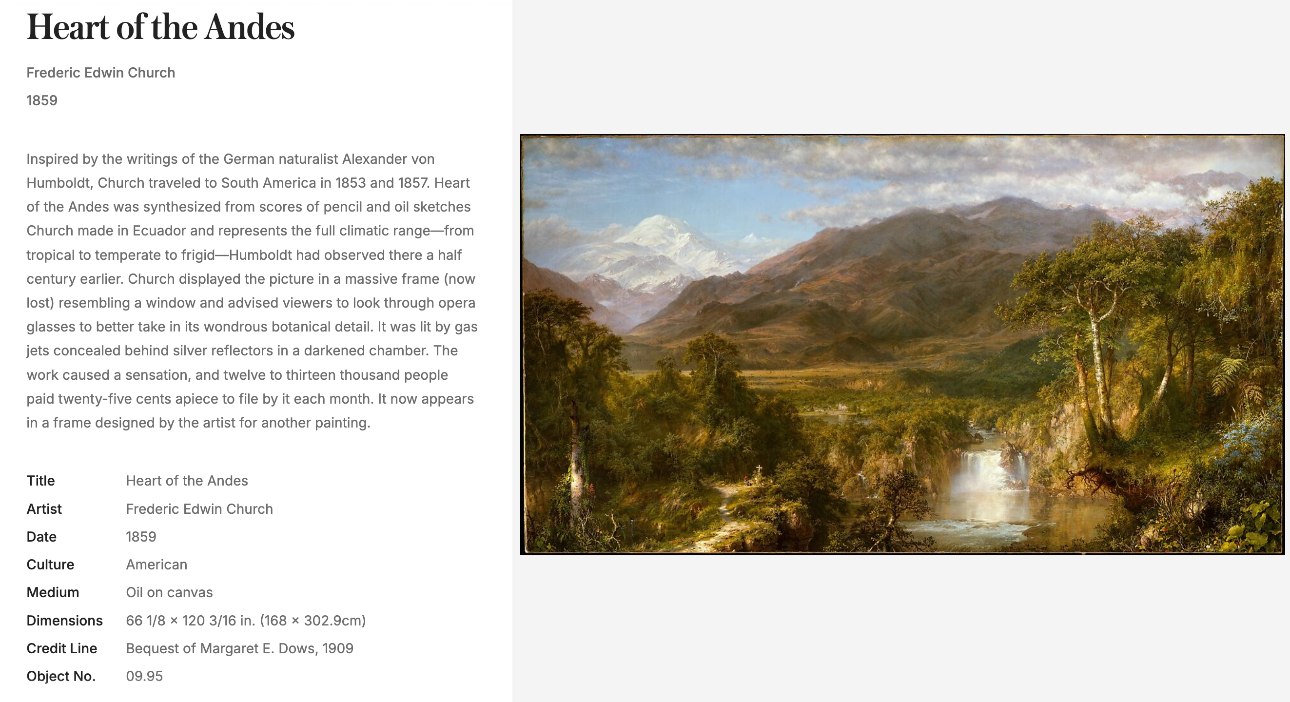 Somewhat exceptional were Frederic Church and Albert Bierstadt, who in a measure extended the heroic landscape ambitions of Cole after his death. Church enjoyed the privilege and distinction of being Cole’s student (1844–46), but supplanted his teacher’s literary and historical conceits with scientific and expeditionary ones. Establishing his reputation with outsize depictions of North American scenic wonders such as Niagara Falls, Church was stirred by the travel accounts and scientific tracts of the German naturalist Alexander von Humboldt to journey twice to South America in the 1850s and paint large-scale landscapes of the equatorial Andean regions that encompassed torrid to frigid habitats in a single picture—the Earth in microcosm. The Museum’s ten-foot-wide Heart of the Andes (09.95) is the most ambitious and acclaimed of these works. It was promoted as a single-picture attraction—i.e., set in a dark, windowlike frame draped with curtains and starkly illuminated in an otherwise darkened room—that drew thousands of paying spectators in New York, London, and eight other American cities. Later Church exhibited “full-scale” paintings of the Arctic regions and the Holy Land.