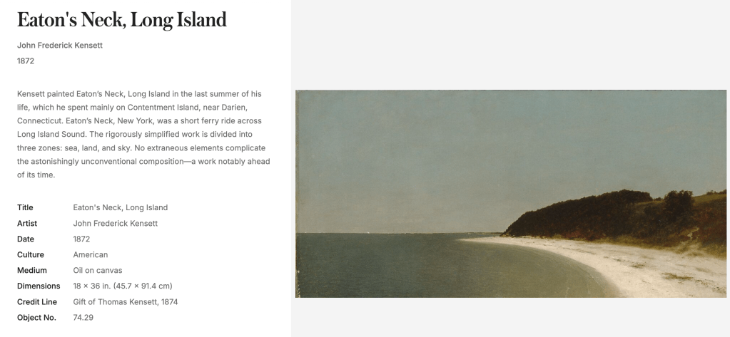 The engraver, portrait, and genre painter Asher Durand was one of the three discoverers of Thomas Cole in 1825 and, in the following decade, was gradually moved to take up landscape painting himself. However, by the time Durand wrote “Letters on Landscape Painting” in the 1850s, he had seen the plein-air work of John Constable, Turner’s colleague and rival, in England, and held Constable’s naturalism up as the standard for young landscape painters—in the process, gently relegating Cole’s histrionic subjects and style to the past. With the example of Durand in both word and practice, outdoor sketching in oils as the foundation of and model for studio landscapes became common, and both plein-airism and the loosening authority of Sublime aesthetics led to a less inflected idiom whose most conspicuous features often were the light influencing terrestrial forms and the air bathing them. This trend coincided with the proliferation of tourist resorts both inland and on the coast during the Civil War period, along with the refinement of the vacation experience—increasingly pursued to relieve the pressures of urban workaday life. Painters who both reflected the new aesthetic standards and accommodated the vacationing class of patrons were John F. Kensett (1816–1872), Martin Johnson Heade (1819–1904), Worthington Whittredge (1820–1910), Sanford Robinson Gifford (1823–1880), Jasper Francis Cropsey (1823–1900), and Jervis McEntee (1828–1891).
