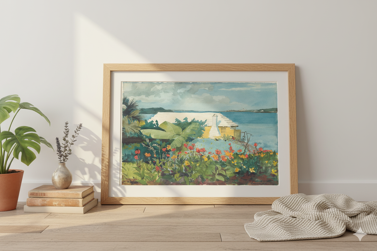 Homer had already built a reputation as one of America’s great painters of the sea, but Bermuda gave him something different an immersion in color. Unlike his rugged Maine coastlines, here he found lush gardens, pastel facades, and air thick with sunlight. The watercolor medium allowed him to capture these fleeting impressions with fluidity, letting color seep and breathe on the paper. There’s something loose and playful in his brushwork, almost as if he were sketching joy itself.