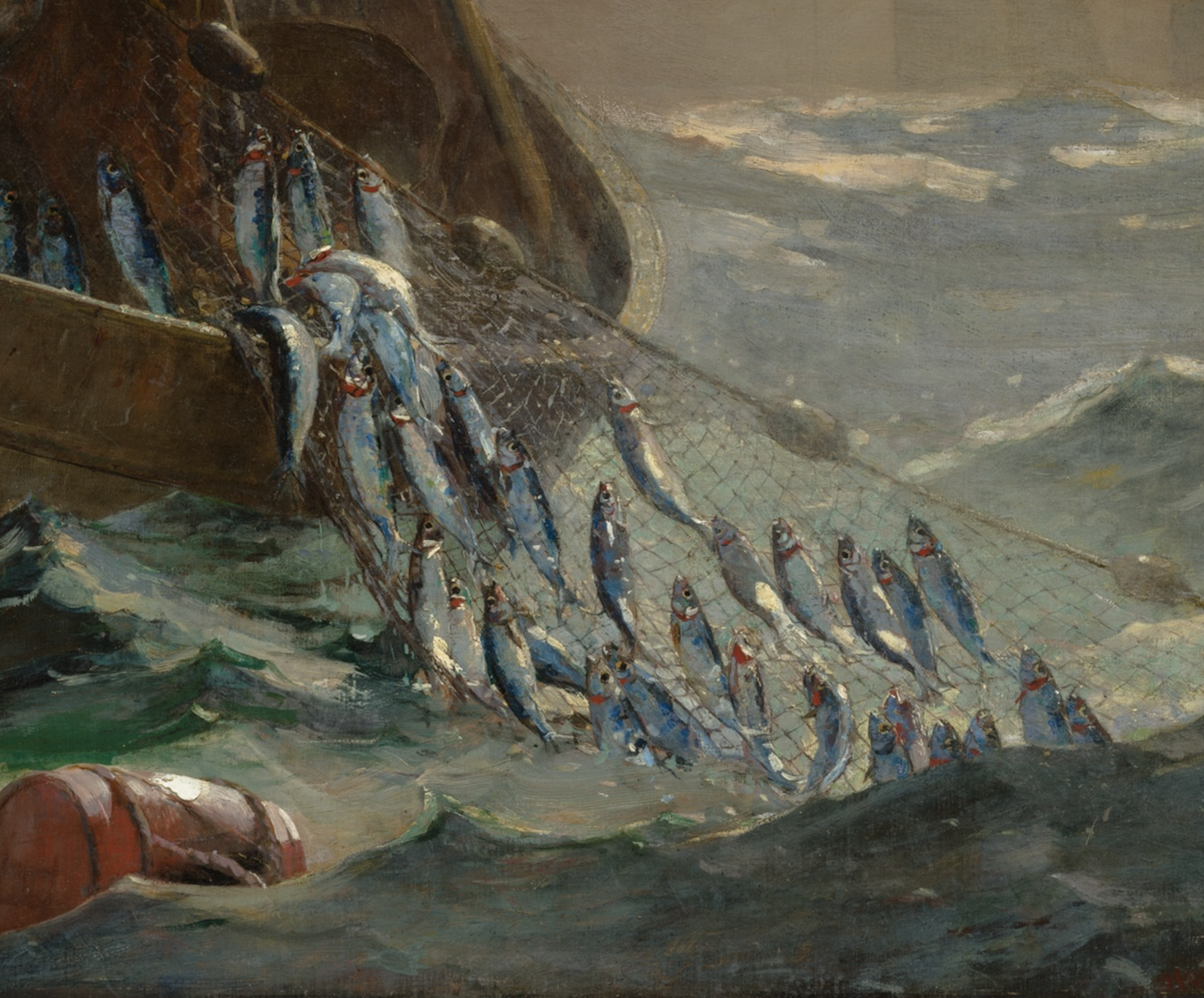 The painting shows two fishermen in a small dory, their world reduced to a grey mist and restless sea. One man hauls a heavy net, glistening with the silver of fresh-caught herring, while the other steadies the boat and empties the catch. The water surges around them, but the men are steadfast—lean, strong, intent. There’s no audience, no comfort, no land in sight. Only labor, light, and the endless rhythm of the ocean.