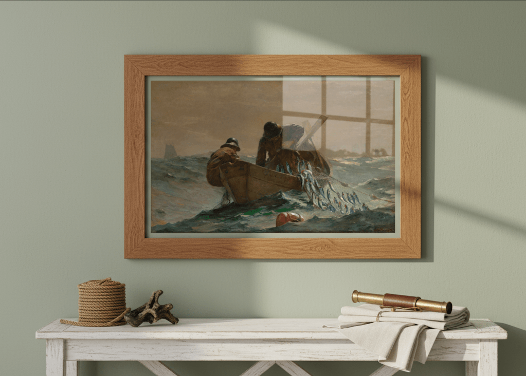 Homer’s brushwork here feels both disciplined and emotional. The tones are subdued, almost monochromatic at first glance, but the longer you look, the more you see—the cool greens of the swells, the fleeting warmth in the fishermen’s faces, the pale shimmer of fish caught in netting. It’s a quiet drama, an understated heroism that tells of survival and devotion. He doesn’t romanticize the sea; he respects it, accepts its danger, and still finds beauty in its relentlessness.