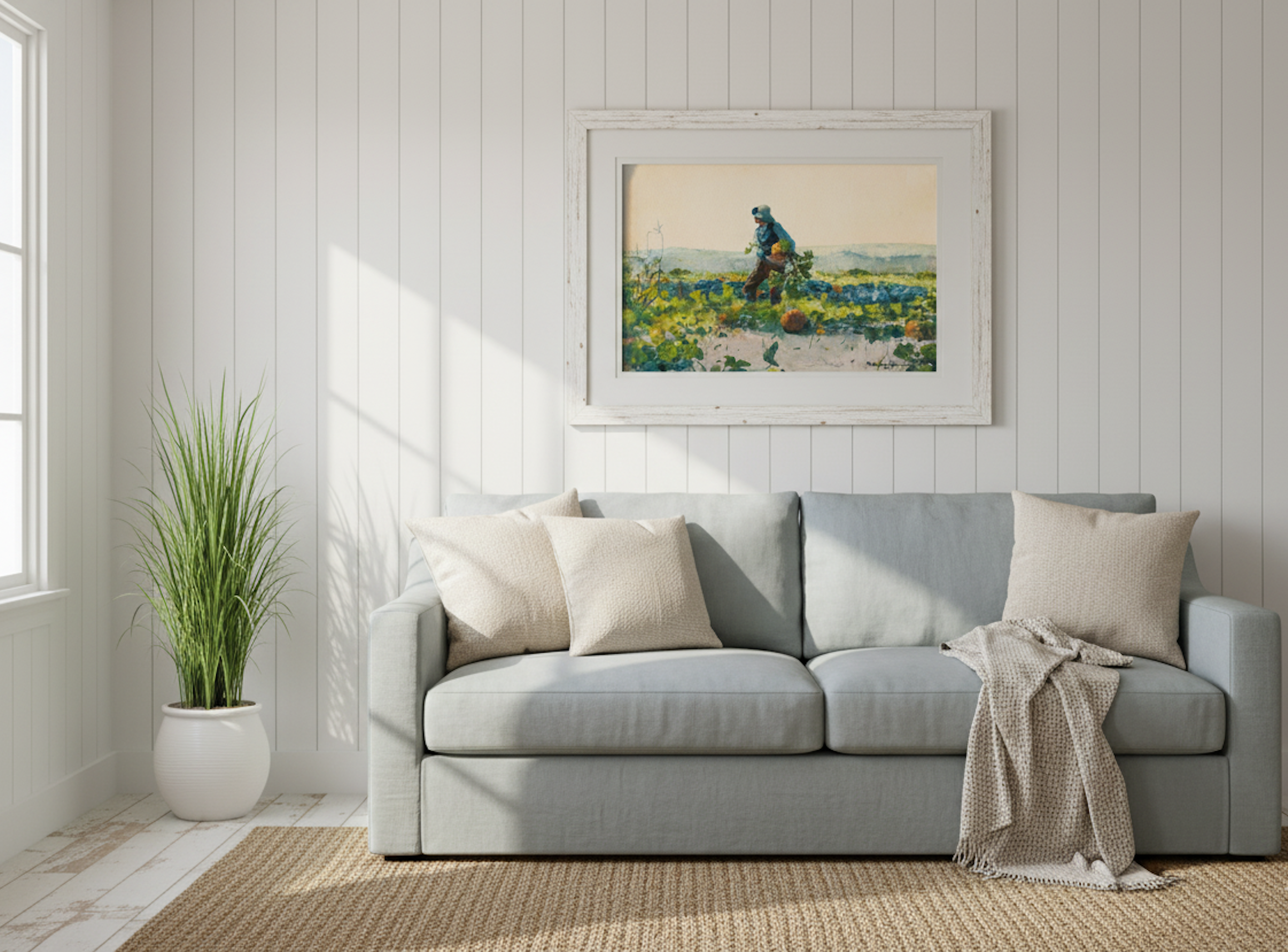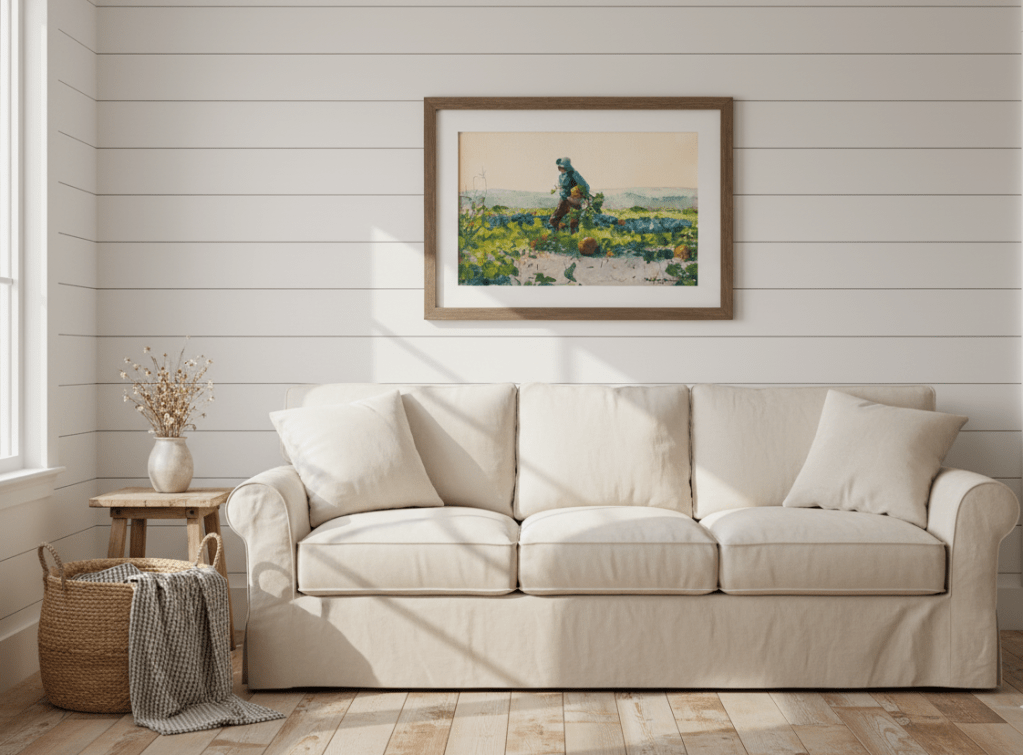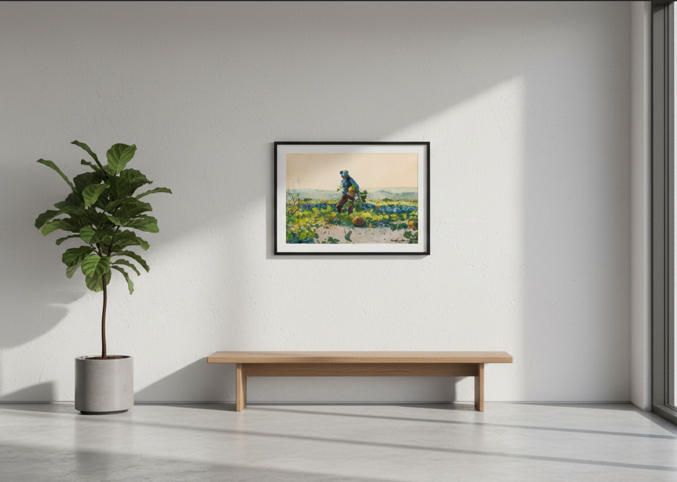 There’s a quiet nostalgia running through Winslow Homer’s For to Be a Farmer’s Boy. Painted in 1887 at his beloved Prout’s Neck studio in Maine, this watercolor revisits one of his favorite themes — rural childhood in America. A young boy pauses amid the harvest, surrounded by golden fields and scattered pumpkins, gazing softly toward what was once a radiant sunset.