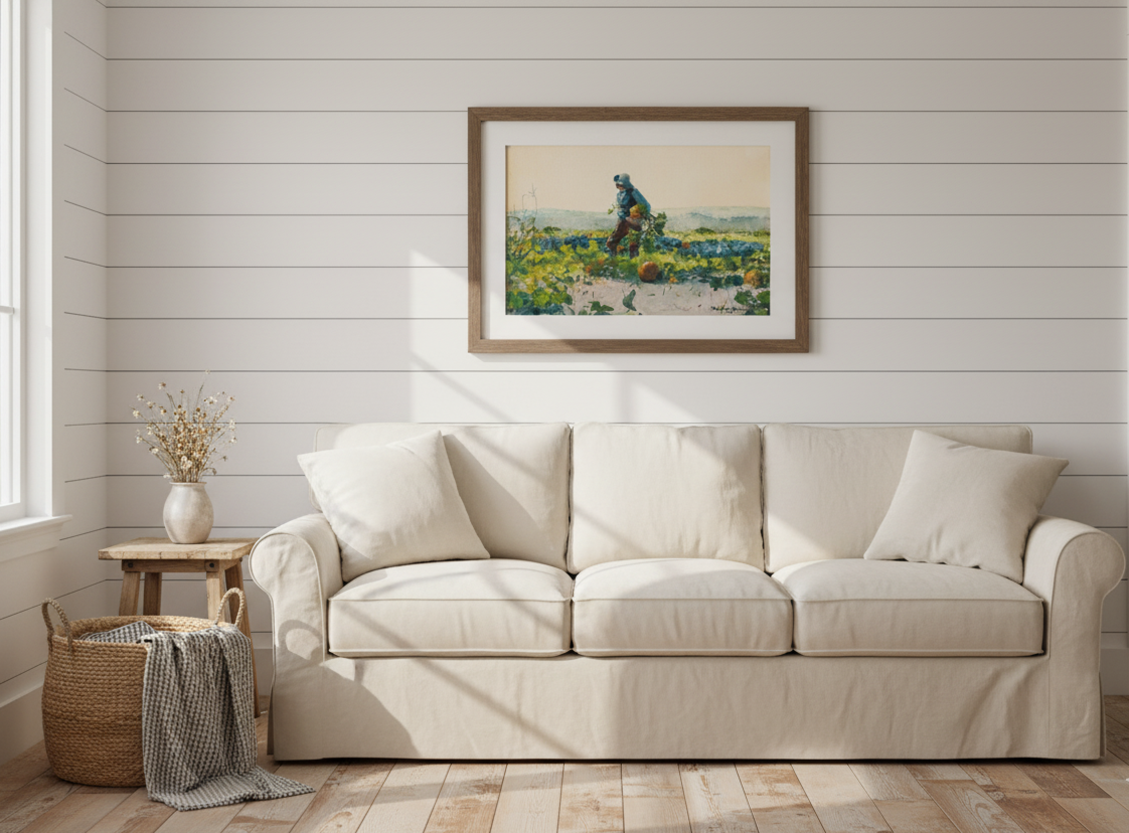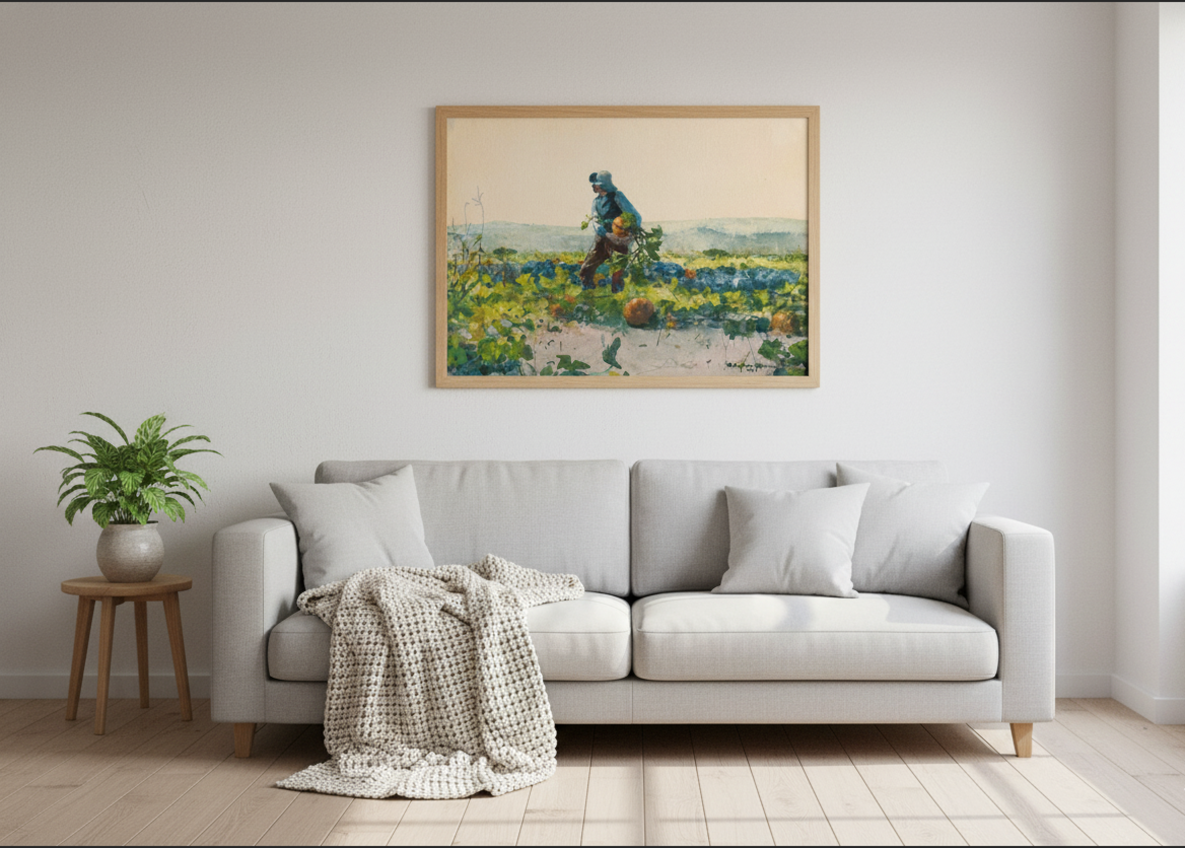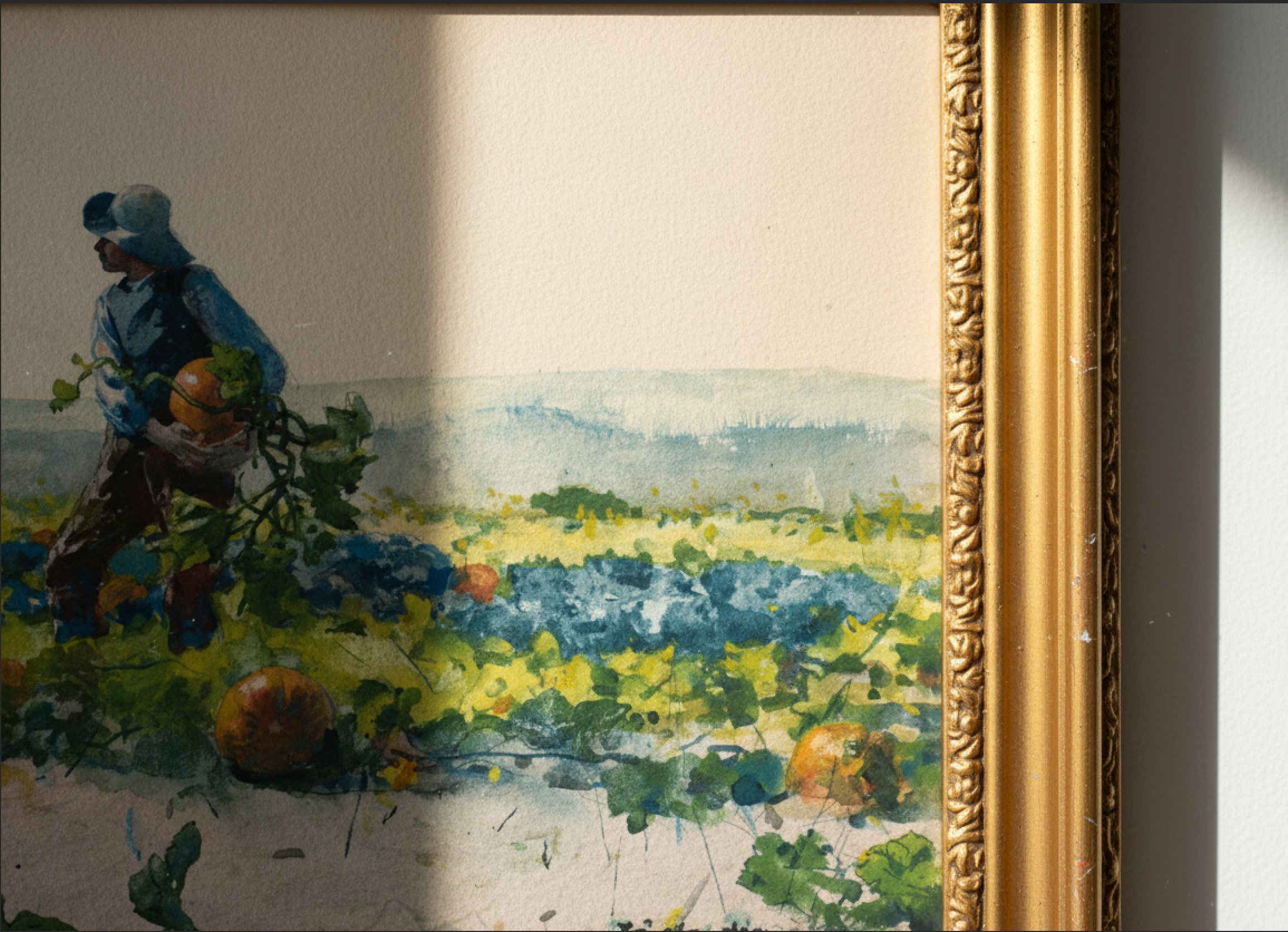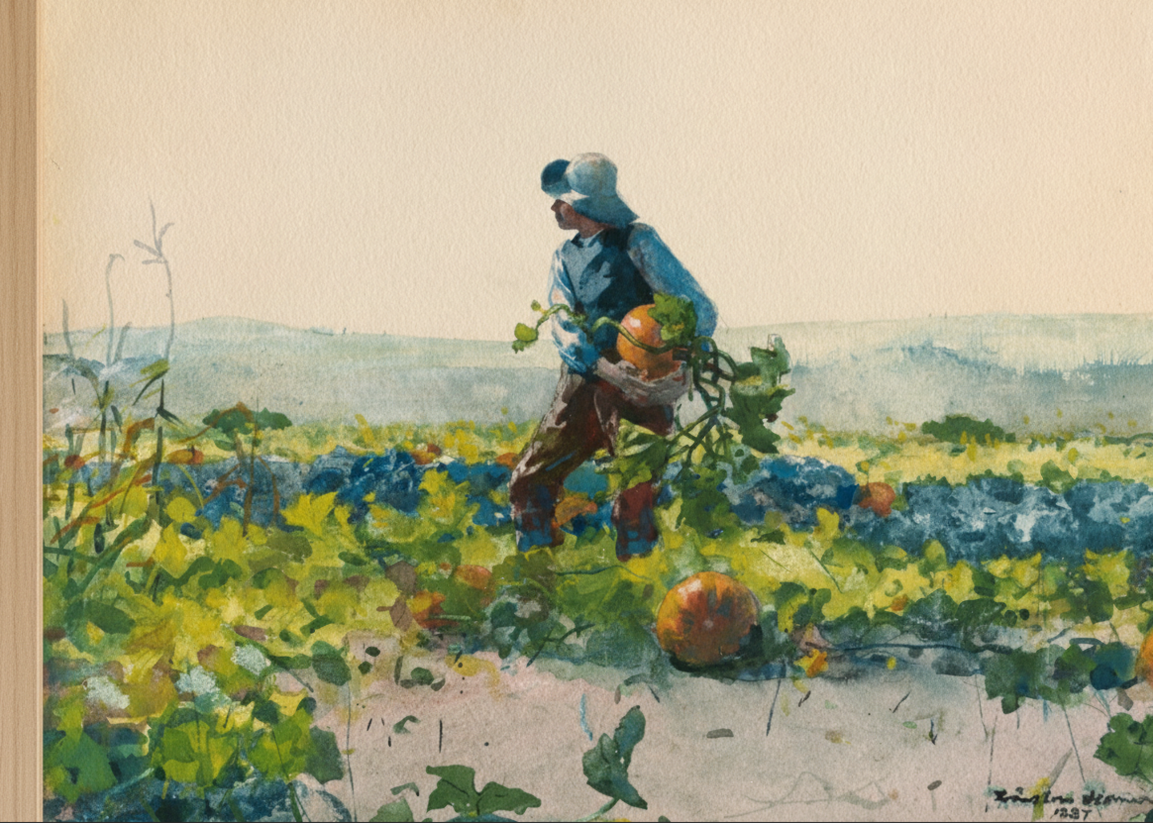 Có một nỗi hoài niệm ấm áp len lỏi trong For to Be a Farmer’s Boy của Winslow Homer. Được vẽ năm 1887 tại xưởng vẽ của ông ở Prout’s Neck, Maine, bức tranh màu nước này quay lại đề tài quen thuộc mà ông luôn yêu mến – tuổi thơ nơi nông thôn nước Mỹ. Một cậu bé dừng tay giữa cánh đồng thu hoạch, xung quanh là những quả bí ngô và ánh vàng của cỏ khô, đôi mắt lặng nhìn về phía hoàng hôn xa.